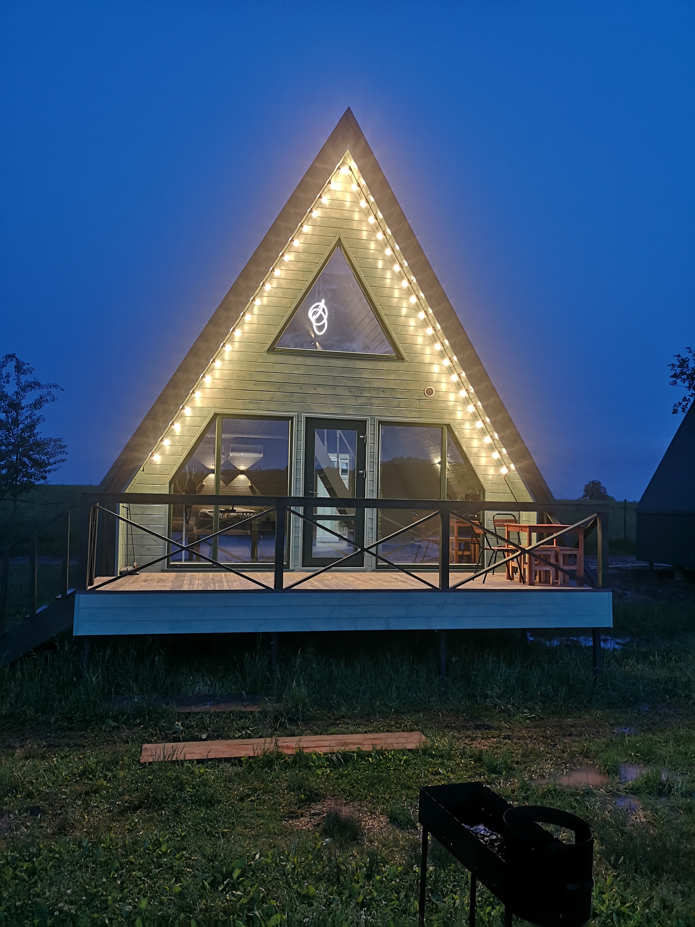Два коттеджа со всеми удобствами с панорамными видами на пруд лес и закат. В коттеджах есть все необходимое для комфортного проживания: санузел, душевая кабина, теплая вода, мини кухня (раковина, плита, мини холодильник, чайник, посуда). Теплый пол. К коттеджам Афрейм есть возможность подъехать на машинах.