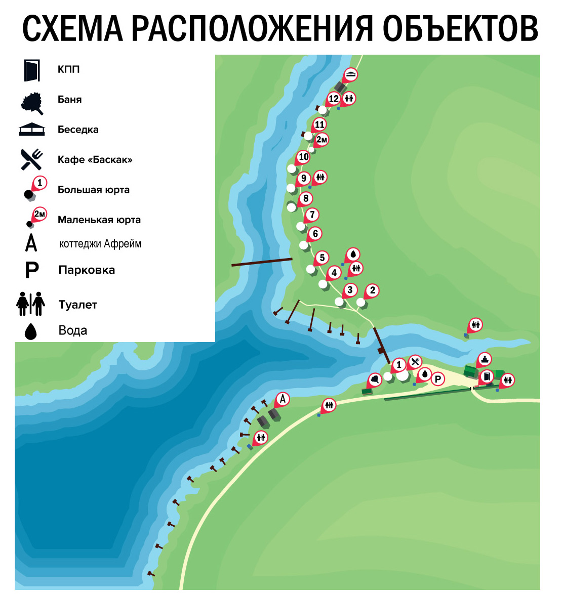 Расположение юрт и беседок на базе Баскак